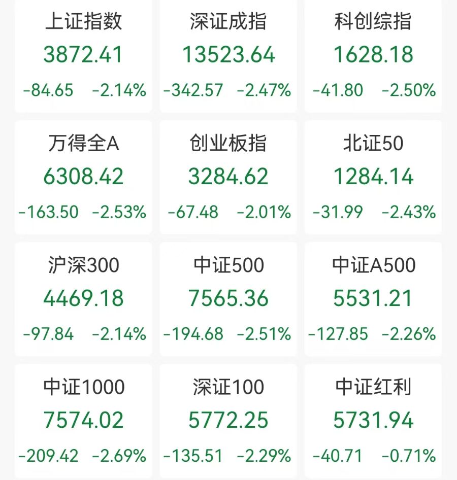 市场早盘低开调整,三大指数均跌超2%,沪指跌破3900点关口。沪深两市半日成交额1.46万亿,较上个交易日放量155亿。盘面上题材弱势轮动,情绪降至冰点,全市场近5000只个股下跌。从板块来看,绿电概念逆势走强,华电辽能6连板,东方新能6天4板,立新能源涨停。机器人概念走高,中大力德、金发科技、首开股份等多股涨停。煤炭板块表现活跃,云煤能源、山西焦煤涨停。太空光伏概念震荡拉升,华民股份触及20CM涨停,中利集团2连板。下跌方面,贵金属概念跌幅居前,赤峰黄金一字跌停。猪肉概念遭重挫,牧原股份、金新农大跌。截至收盘,沪指跌2.5%,深成指跌2.53%,创业板指跌2.44%。