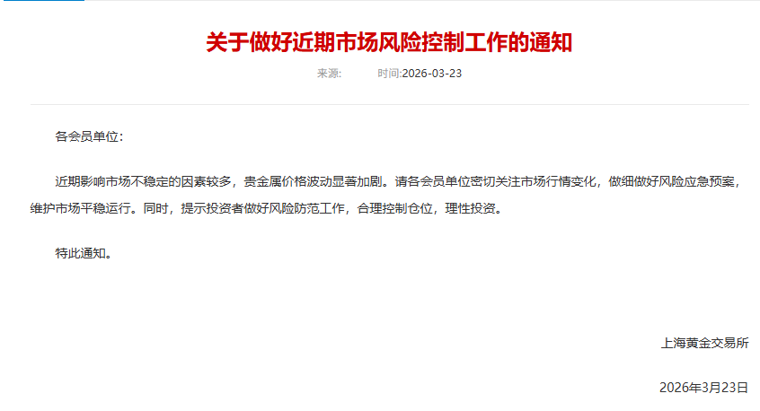 上金所发布通知,近期影响市场不稳定的因素较多,贵金属价格波动显著加剧。请各会员单位密切关注市场行情变化,做细做好风险应急预案,维护市场平稳运行。同时,提示投资者做好风险防范工作,合理控制仓位,理性投资。