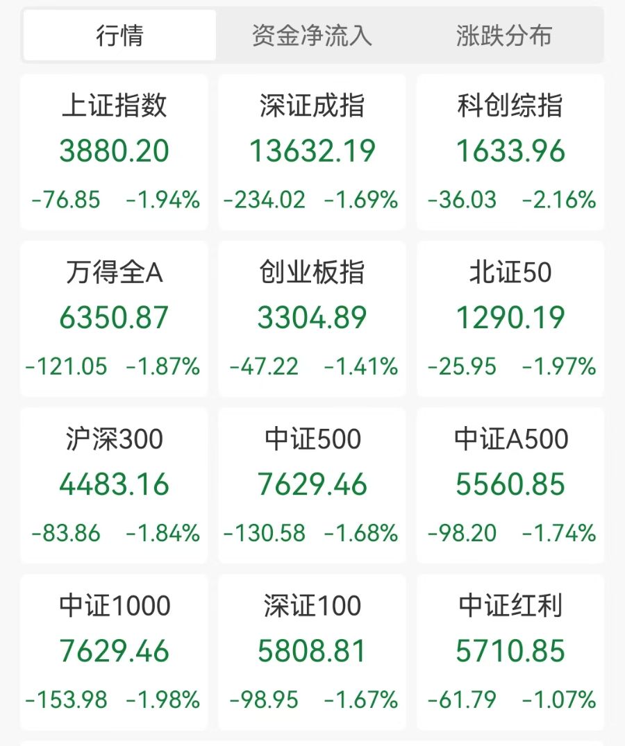 沪指跌1.94%,报3880.2点。深成指跌1.69%,创业板指跌1.41%。