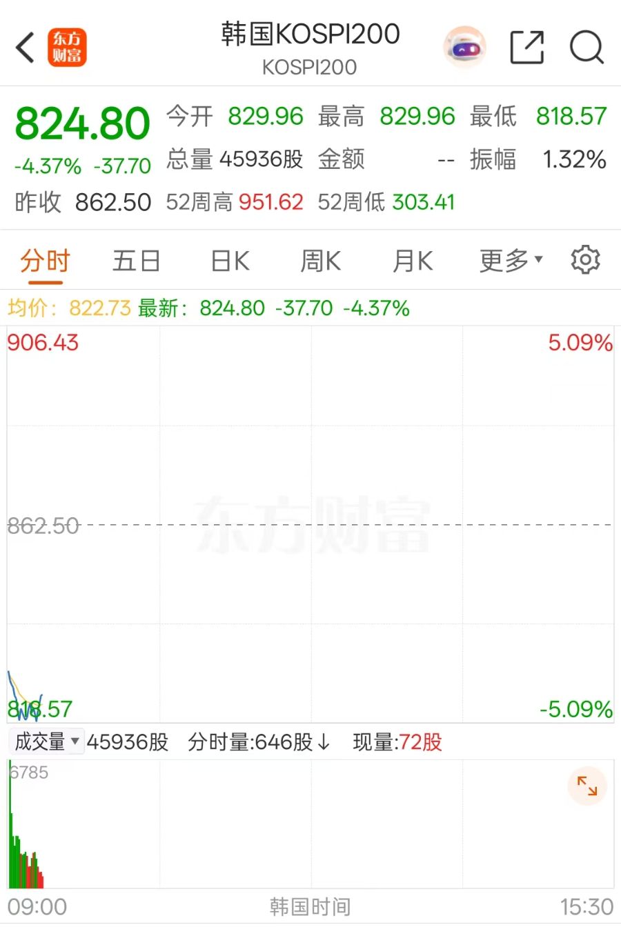 韩国交易所于KOSPI 200期货下跌5%后启动KOSPI指数熔断机制,程序化交易暂停5分钟。