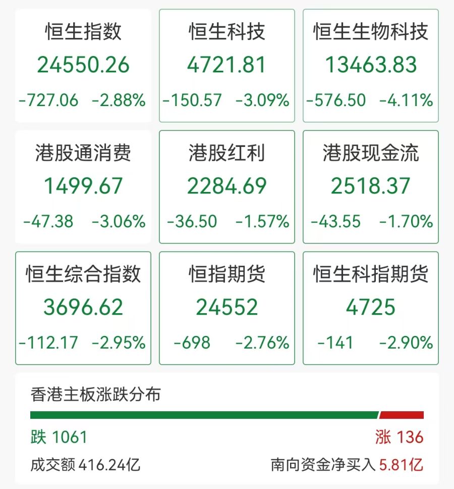 港股股指午后持续下挫,恒生科技指数、恒生指数跌幅均扩大至4%。
