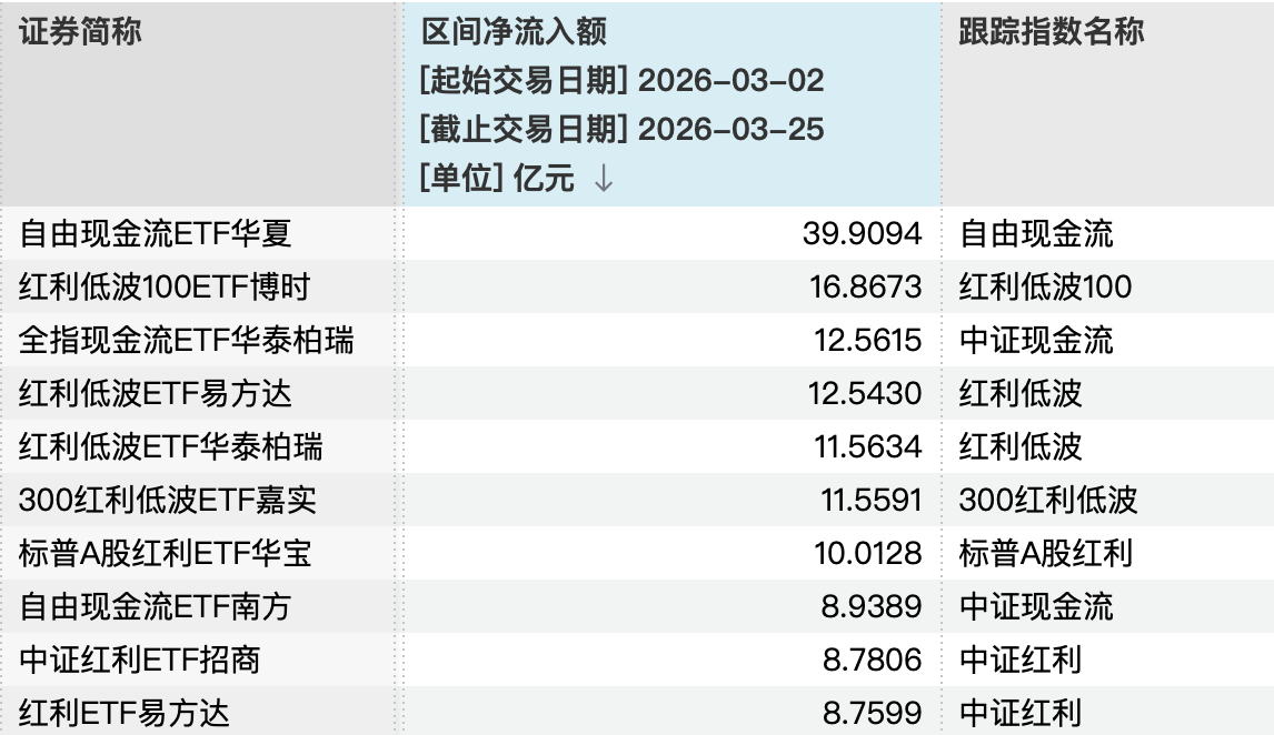 3月2日~3月25日,自由现金流ETF、红利ETF分别净流入104.87亿元、85.31亿元。