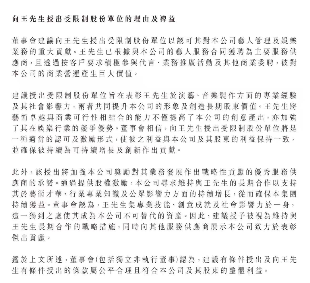 值得一提的是,在公告中,乐华娱乐董事会还提到,确保王一博续签及长期委聘对集团的业务稳定至关重要。挽留王一博带来的长期稳定性及可持续表现超过对少数股东的最小摊薄影响,更好地符合全体股东的整体利益。