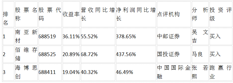 按收益率降序排列,南亚新材(688519)、佰维存储(688525)、海博思创(688411)凭借优异表现跻身前三,成为本次高增长企业中的"明星股"。