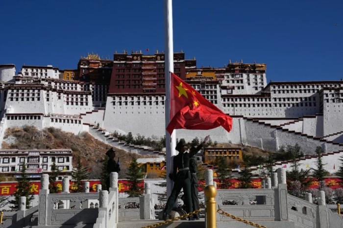 2025年3月28日,西藏各族各界人士在拉萨布达拉宫广场,升国旗、唱国歌,参加西藏百万农奴解放66周年纪念活动。 图为升国旗仪式现场。