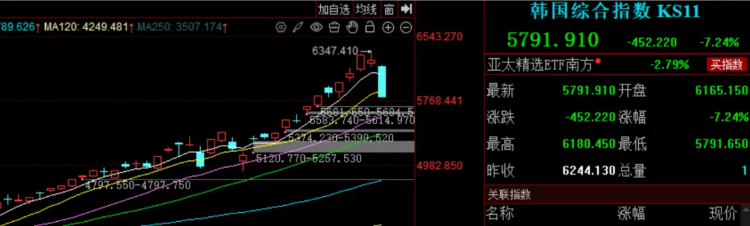 韩国综合指数暴跌超7%,盘中一度触发熔断机制,韩国金融市场昨日因假期休市。在此之前,韩国股市持续狂飙,截至上周五收盘,年内累计涨幅超48%,牛冠全球。