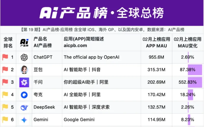 据财联社报道,AI产品榜3月3日发布的全球AI应用最新数据显示,MAU(月活用户数)排名前三的AI应用分别为ChatGPT、豆包和千问,其中,千问以2.03亿MAU成为全球第三大AI应用,并以552%的增速居全球第一。从榜单看,国内AI应用已呈现豆包、千问双雄并立的格局。