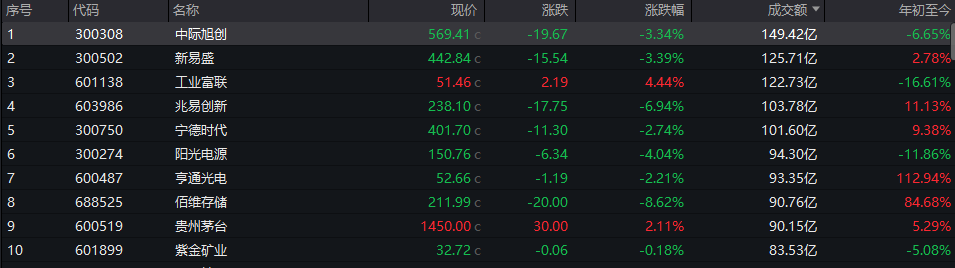 个股方面,中际旭创全天成交额超149亿元位居沪深两市第一,新易盛、工业富联、兆易创新等成交额居前。