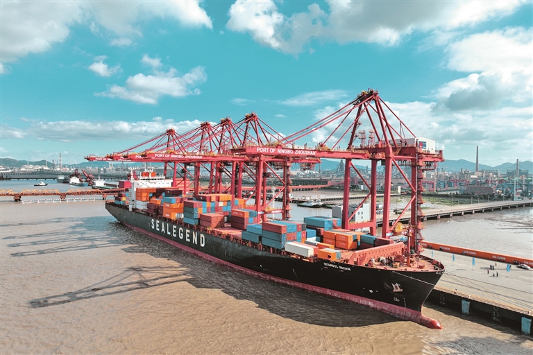 2025年9月22日,浙江宁波舟山港开通首条中欧北极集装箱快航航线后,相关货轮在港口装卸货物。新华社发