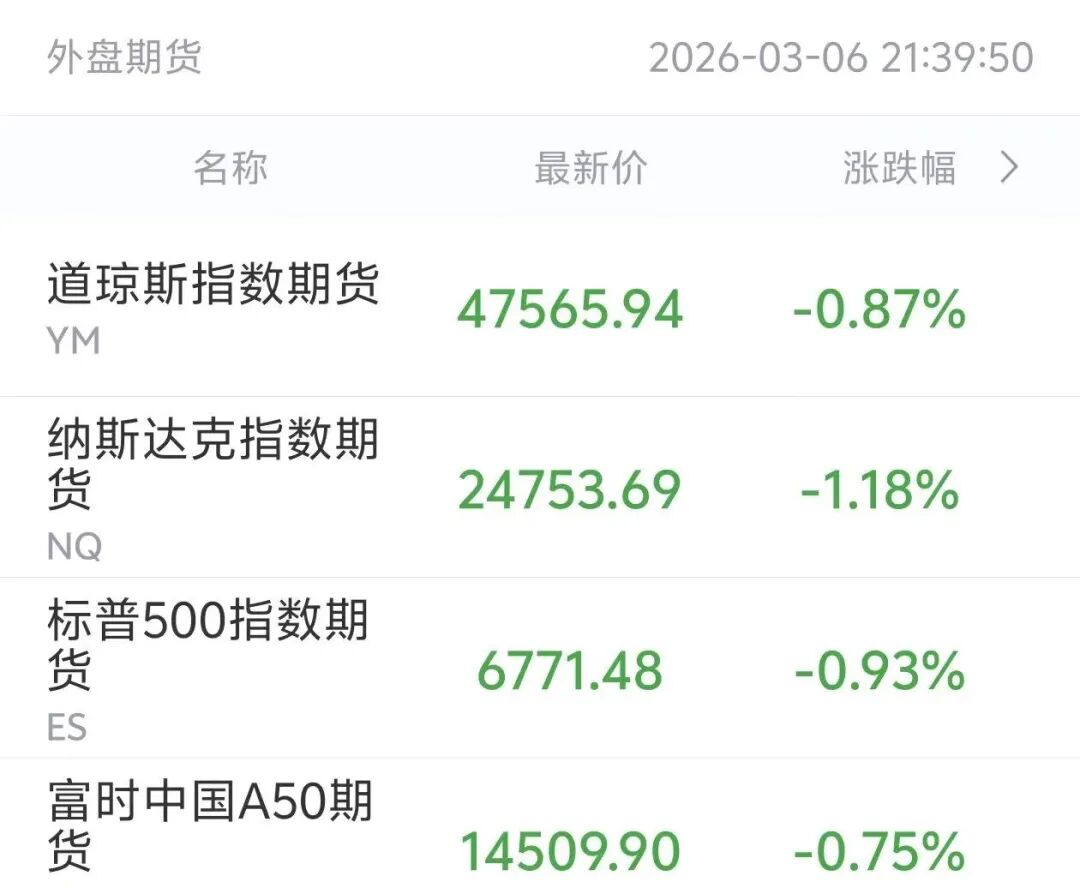 美股期指跌幅扩大,截至发稿,道指期货跌0.87%,纳指期货跌1.18%,标普500指数期货跌0.93%。