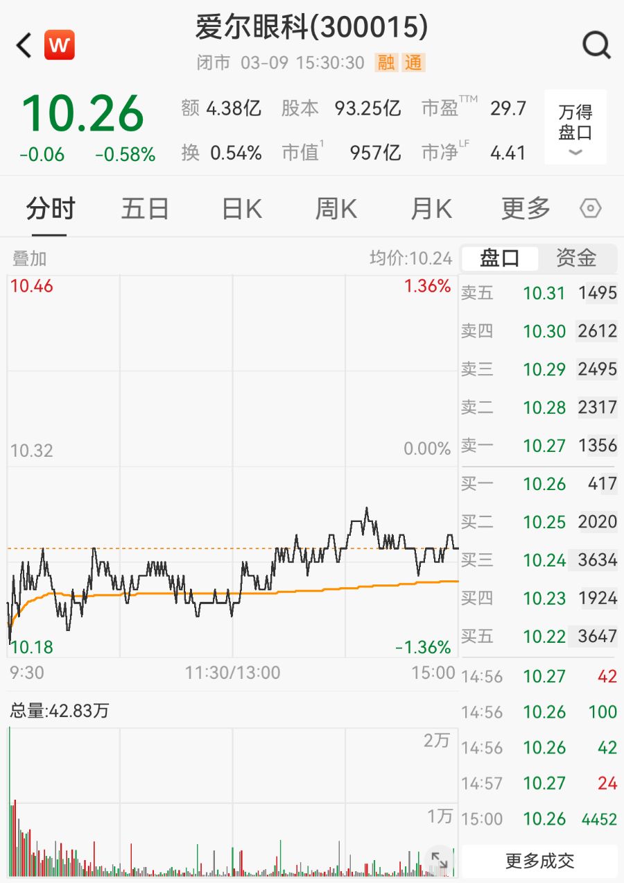 截至3月9日收盘,爱尔眼科报10.26元/股,跌0.58%,总市值为957亿元,较2021年7月近4000亿元的总市值已跌超七成。