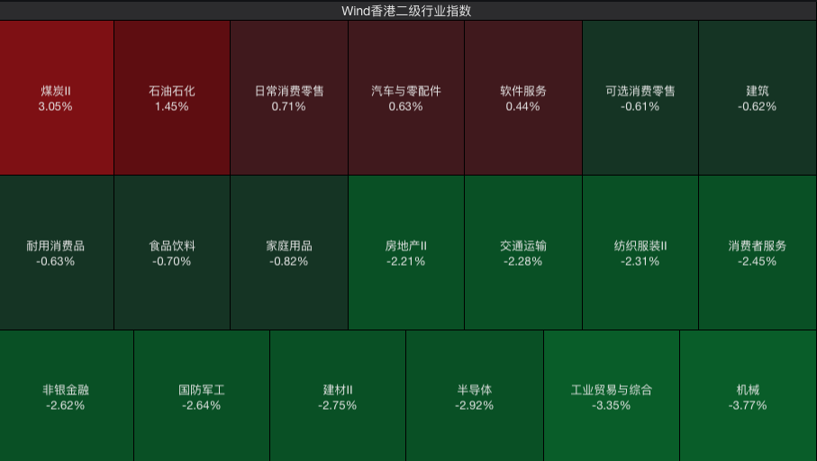 跌幅前三行业为机械(-3.77%)、工业贸易与综合(-3.35%)、半导体(-2.92%),反映市场火队制造业及芯片仍有短期分歧。代表个股如兆易创新(03986.HK)跌6.59%,上海复旦(01385.HK)跌5.31%。