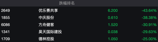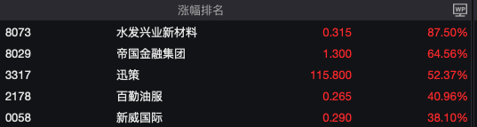 个股层面,涨幅前三分别为水发兴业新材料(8073.HK,+87.50%)、帝国金融集团(8029.HK,+64.56%)、迅策(3317.HK,+52.37%);跌幅前三包括优乐赛共享(2649.HK,-43.64%)、中庆股份(1855.HK,-38.38%)、方舟健客(6086.HK,-30.91%)