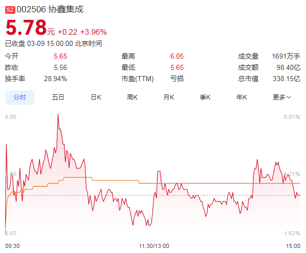 3月9日,协鑫集成逆势上涨3.96%,收盘价为5.78元,成交额为98.40亿元,总市值攀升至338.15亿元。据统计,自2026年1月22日以来的27个交易日内,协鑫集成股价累计涨幅超过109%,表现非常亮眼。