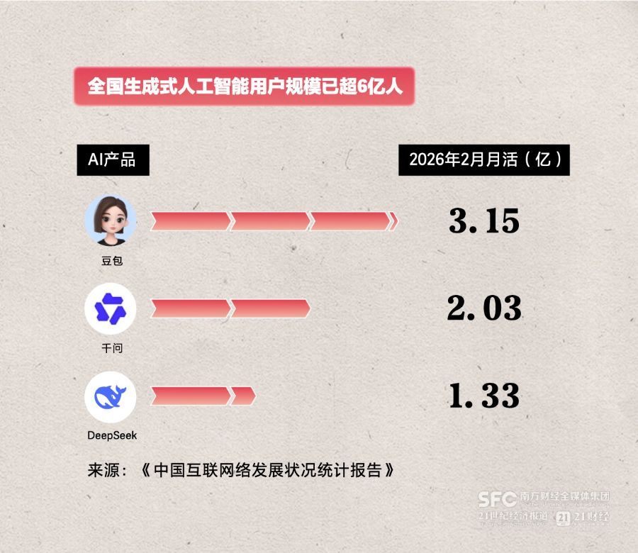 第三,是史无前例的全民普及。今年春节,你抢到AI红包,喝上大厂请的奶茶了吗?这场全民级的 AI 测试,进一步让科技走进普通人的日常。目前,豆包、千问、DeepSeek这三款产品的月活全部破亿,全国生成式人工智能用户规模已超6亿人。