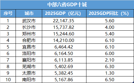 2025年,中部六省GDP总量排名前五的城市依次为武汉(22147.4亿)、长沙(15737.8亿)、郑州(15244.6亿)、合肥(14210亿)、宜昌(6464.42亿)。