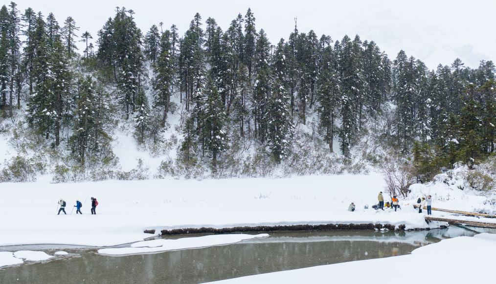 游人在白普隆沟牧场感受雪景。新华社记者 普布次仁 摄