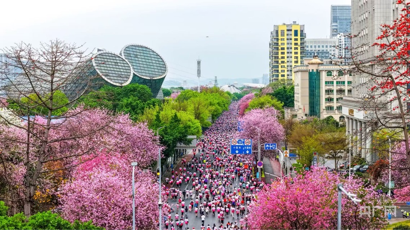 2026柳州全民跑、马拉松不久前也迎“花”开跑,赛道串联起著名地标与美景,满城繁花与蜿蜒柳江、风格各异的建筑相映成画,被跑者们赞道:“每一公里,都有山水作伴、繁花相迎。”