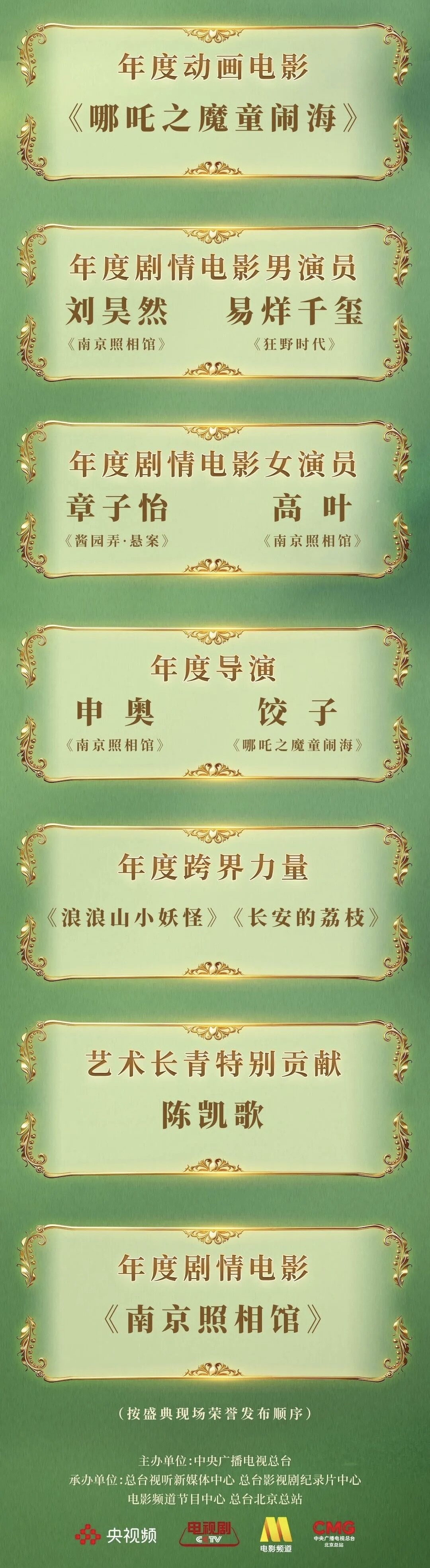 《南京照相馆》斩获年度剧情电影、年度导演、年度编剧、年度剧情电影男演员、年度剧情电影女演员共五项荣誉。导演申奥在发表感言时特别感谢,在总台领导的建议下,将电影名从《吉祥照相馆》改为《南京照相馆》,“南京”两个字有着厚重的历史感、家国情,督促着我们创作出更具有广度和深度的作品。