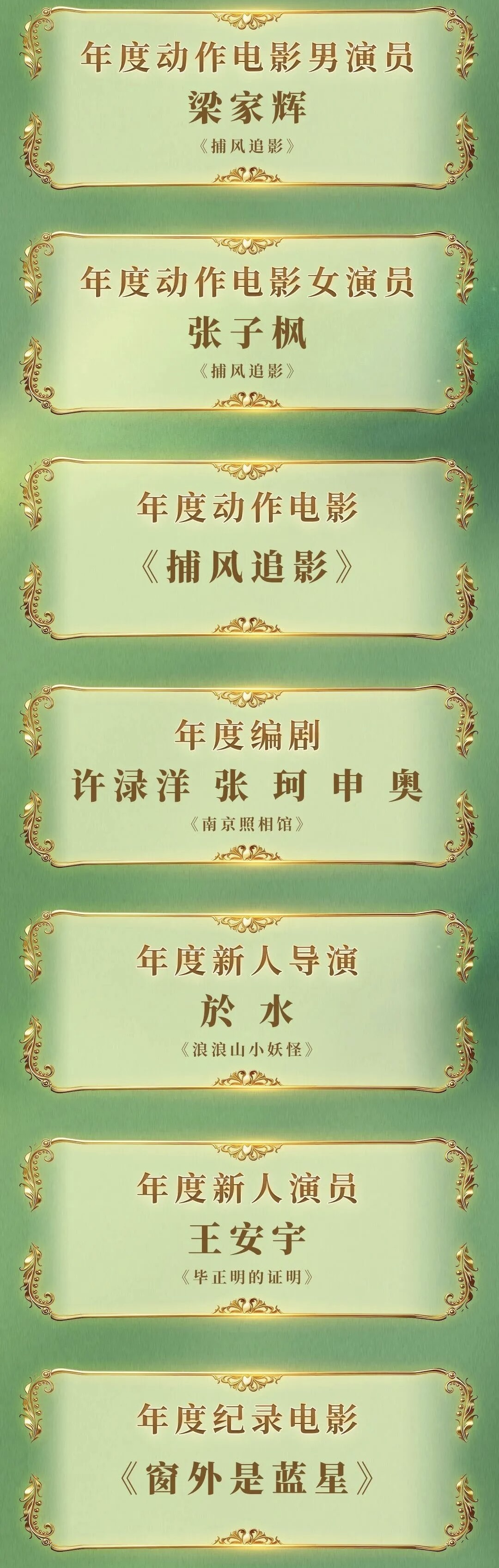动作电影《捕风追影》荣获年度动作电影、年度动作电影男演员、年度动作电影女演员三项荣誉。《唐探1900》荣获年度喜剧电影。《长安的荔枝》主演大鹏在领取年度喜剧电影男演员荣誉时感言:“第一次有一个荣誉鼓励喜剧创作,从来没有这么被重视过。”