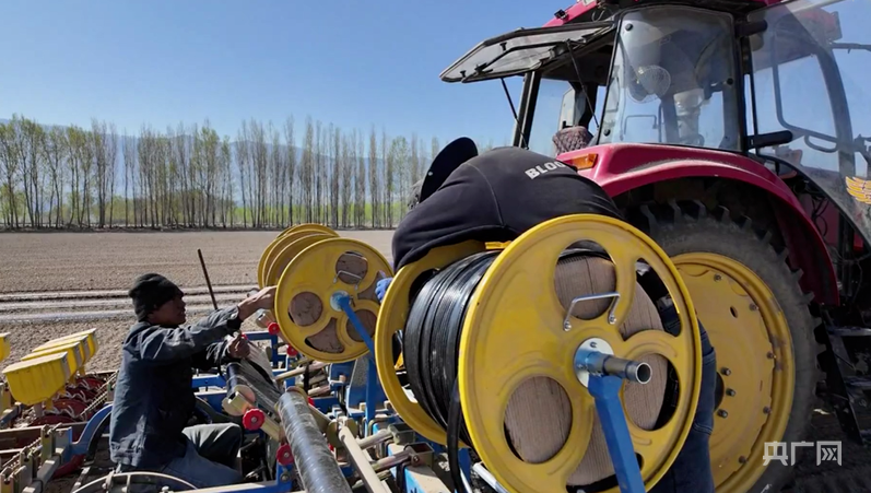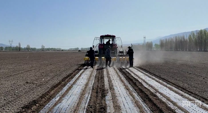 种植户使用大型农机开展机械化铺膜播种作业 (吾兰 摄)