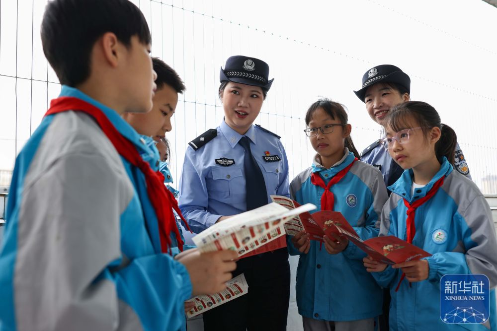 ↑ 4月14日,在河南省焦作市温县西关小学,民警为学生们讲解国家安全知识。新华社发(徐宏星摄)