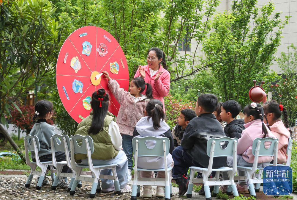 ↑ 4月14日,在江苏省句容市北部新城幼儿园,小朋友通过互动游戏了解国家安全相关知识。新华社发(钟学满摄)