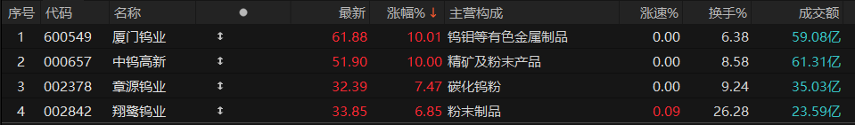 厦门钨业、中钨高新涨停,章源钨业、翔鹭钨业跟涨。