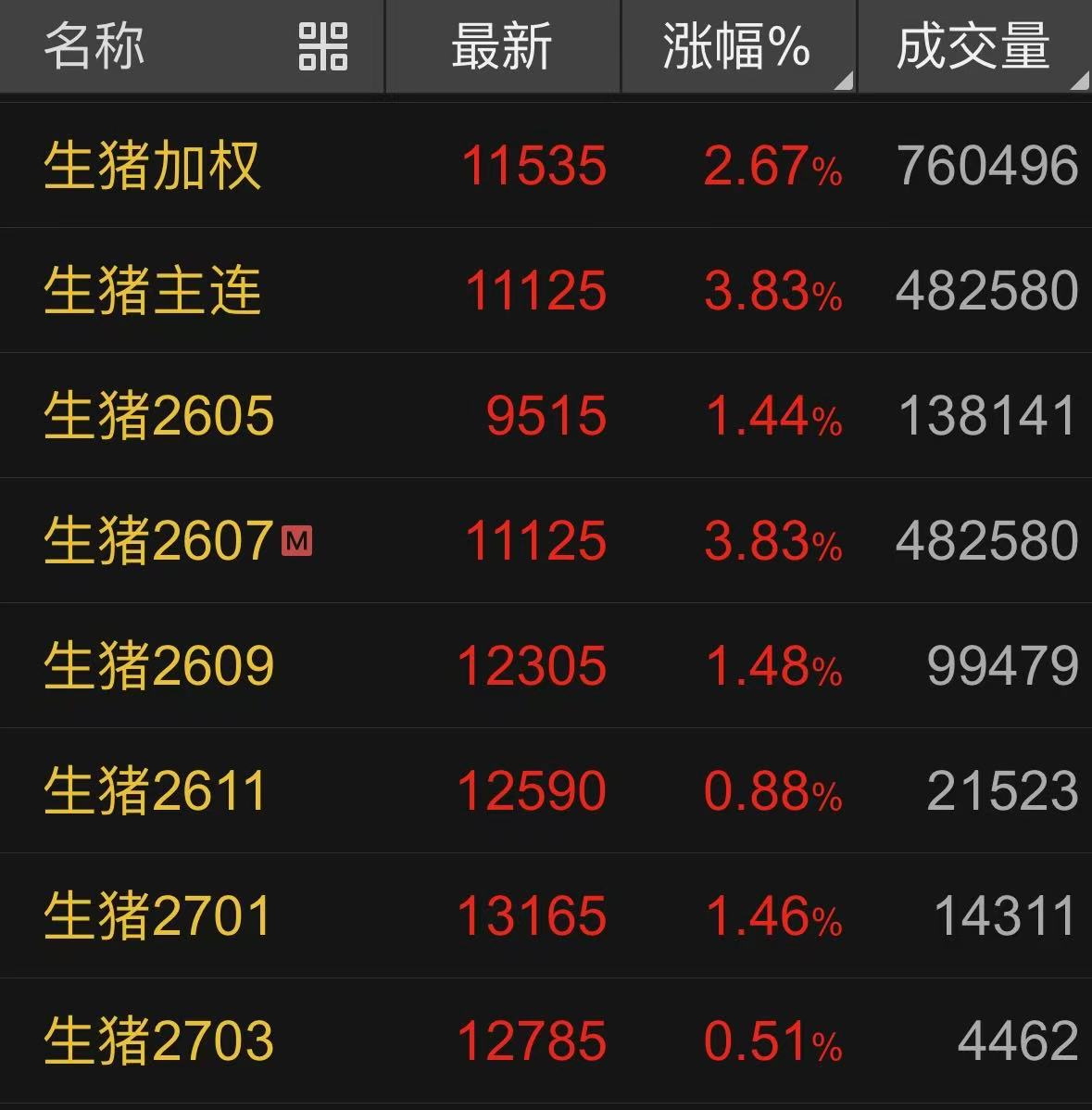 当天,生猪2607合约大涨5%,带动生猪2605、生猪2609等合约集体反弹。