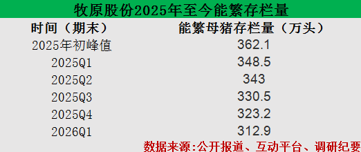 对比2025年末数据,相当于今年一季度公司再减10万头能繁母猪。如果与2025年362.1万头的峰值对比,公司整体能繁母猪存栏量已经减少13.59%。