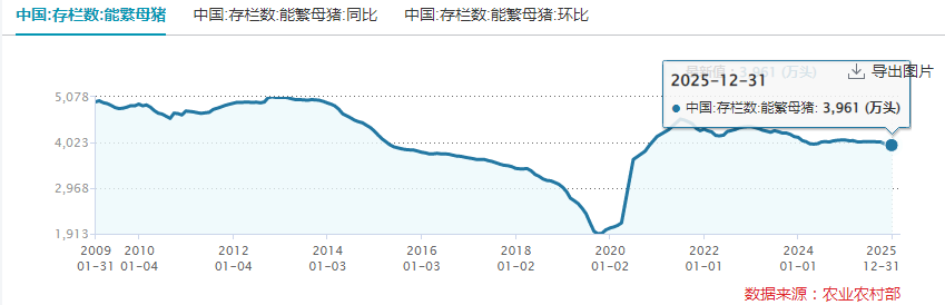 农业农村部公布数据显示,2025年全年国内能繁母猪存栏量由4078万头降至3961万头,降幅为2.87%。