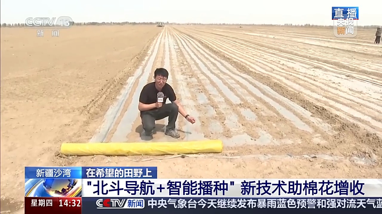 高鹏飞:您瞧,我身后这台棉花播种机,正不紧不慢地往前开。从空中看下去,播完种的土地就像铺上了一条条透明的丝带,笔直笔直的。怎么能做到这么整齐划一?全靠有北斗导航的无人驾驶设备。这种设备精度很高,每公里误差不超过2厘米。为什么要这么精准?因为后面的中耕、打药这些田间管理,也都靠带着北斗导航的设备来干。这样从播种到管理,环环相扣,无缝衔接。像这种复合式精量化播种机,后面还挂着好几个装置,它一过,铺设滴灌带、地膜、打孔、下种、覆土一气呵成。一台机器一天能干120多亩,效率那是翻着跟头往上涨。