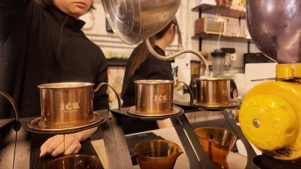 ↑店员在制作越南滴漏咖啡。(刘樱涵 摄)
