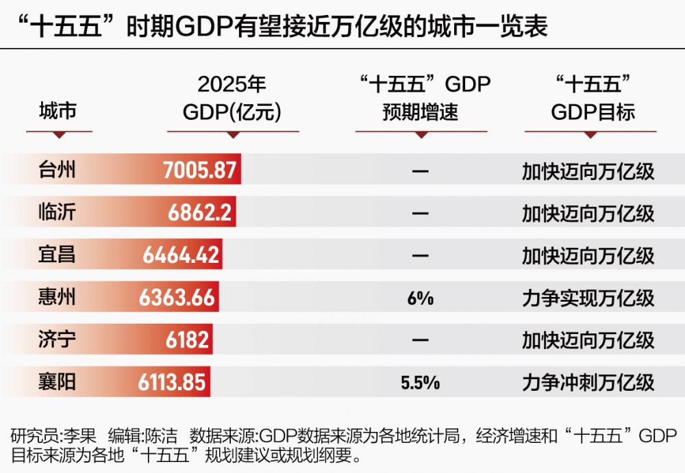 21世纪经济研究院研究员通过梳理地方“十五五”规划、2026年政府工作报告发现,有14座城市的GDP有望在“十五五”期间破万亿。另有6座城市或在“十五五”末接近万亿级,为“十六五”的晋级积蓄力量。