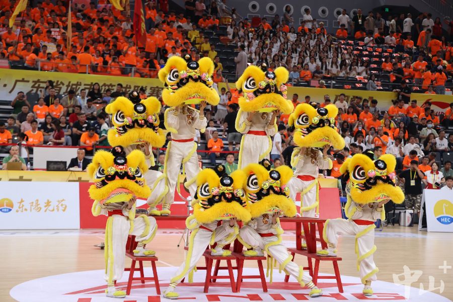 小榄镇永宁龙狮武术团派出的大头佛,携手电子科技大学中山学院啦啦操舞蹈队的学生,演绎了趣味十足的“佛扇戏醒狮”。
