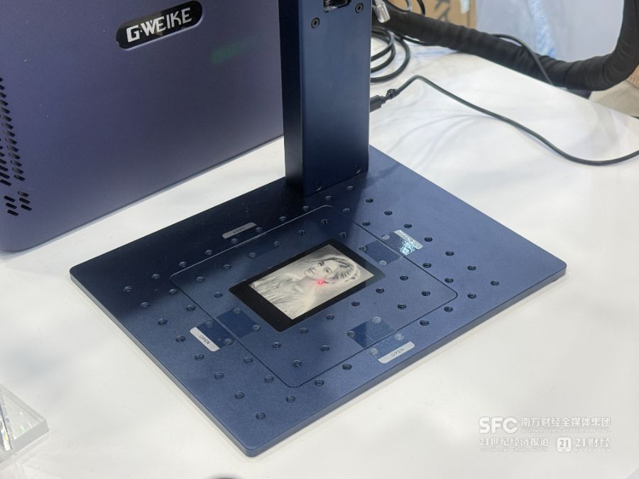 “这款20瓦的光纤激光打标机,是我们这届展会的明星产品。”杜佳繁拿起一块金属板,上面的黑色图案精致清晰,“它可以在碳钢、不锈钢、木头、亚克力等多种材质上打标,甚至能实现‘所拍即所得’——客户用手机拍照上传,通过云端连接就能精准雕刻。”