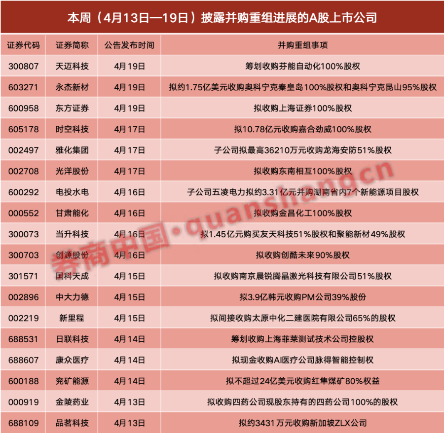 4月19日,多家A股公司宣布重大资产重组,部分公司股票自4月20日起停牌。