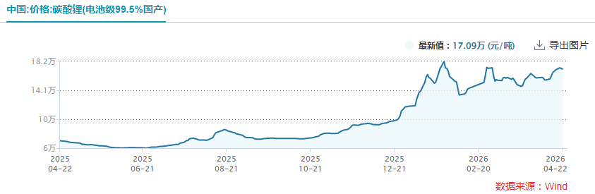 今年则明显不同。国内碳酸锂价格自2025年6月末触底后持续反弹,如今已经从最低点的6万元/吨以下升至17万元/吨左右。