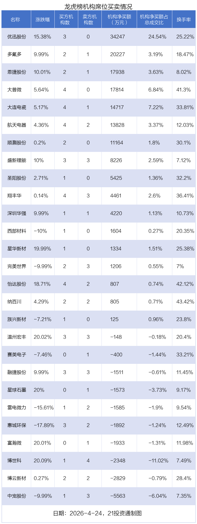 其中,机构净买入金额最多的是优迅股份(688807.SH),当日收盘上涨15.38%,换手率为25.22%。