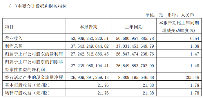 4月24日,贵州茅台(600519.SH)公告称,2026年第一季度实现营业收入539.09亿元,同比增长6.54%;归属于上市公司股东的净利润为272.43亿元,同比增长1.47%。