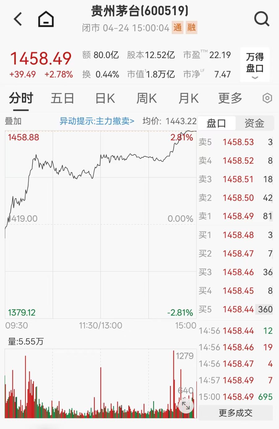 股价方面,截至4月24日收盘,贵州茅台股价报1458.49元/股,最新市值为1.8万亿元。