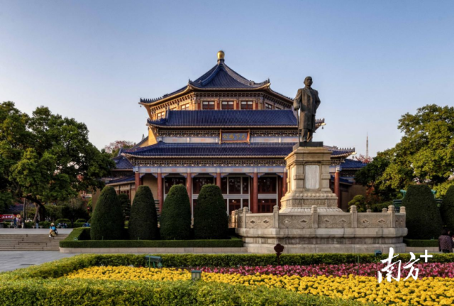 出来后往南走,中山纪念堂的蓝色琉璃瓦在阳光下发光。