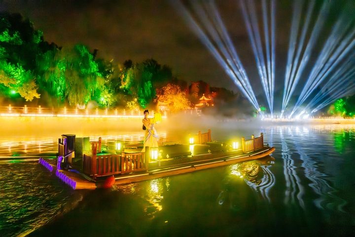 同一种“活化”文脉的手笔,在扬州古运河上演着别样的精彩。在全国首创的“行进式游船+岸线光影科技+实景演艺”模式中,《大运扬州》将2500年的运河史浓缩在60分钟的航程里。船行水上,两岸全息水幕骤亮,李白仗剑吟诗、吴王夫差开凿邗沟的恢弘景象扑面而来。这里的历史不再是冰冷的展品,而是可以与之对望、共情的精神纽带。
