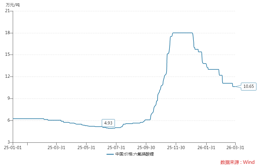 根据Wind统计,2025年四季度、2026年一季度,国内六氟磷酸锂均价分别为13.63万元/吨、13.18万元/吨,均显著高于2025年一季度的6.2万元/吨均价。