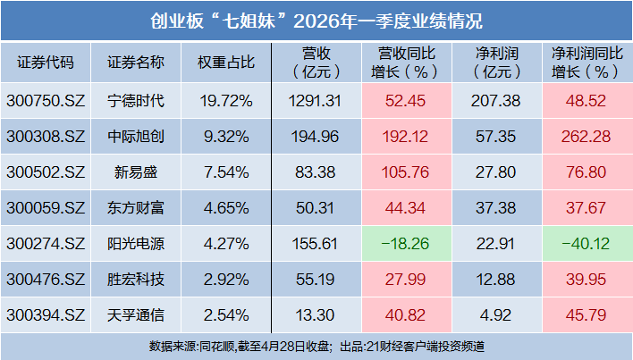 从赛道分布来看,“七姐妹”的构成清晰勾勒出创业板的产业结构:截至2026年4月,这七家企业在创业板50指数中的总权重达50.96%,其中新能源双雄宁德时代(19.72%)与阳光电源(4.27%)合计占比23.99%;AI算力产业链上的中际旭创(9.32%)、新易盛(7.54%)、天孚通信(2.54%)与胜宏科技(2.92%)合计占比22.32%;金融科技龙头东方财富以4.65%的权重补全版图。