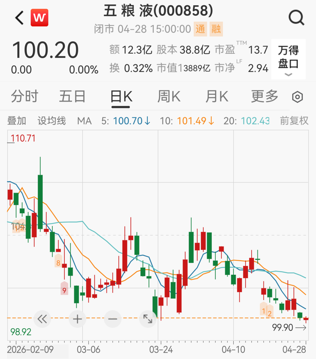 五粮液近期股价呈下降趋势,截至 4月28日收盘,五粮液报100.2元/股,总市值为3889.4亿元。