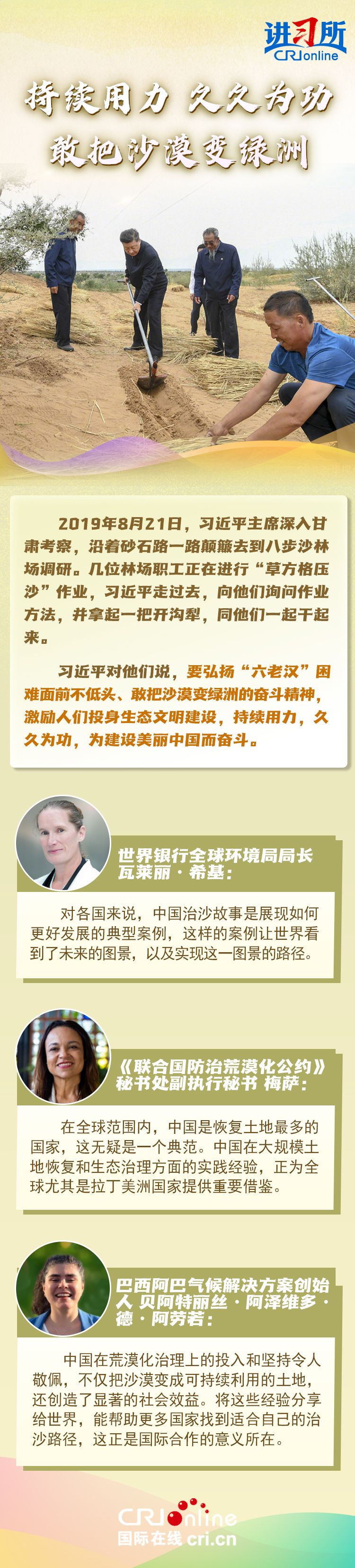 中共十八大以来,中国森林面积和蓄积量持续“双增长”,荒漠化和沙化土地面积持续“双缩减”,是全球增绿最多最快的国家。习近平主席始终身体力行:在北京连续14年参加首都义务植树活动,在甘肃与林场职工一起进行“草方格压沙”作业,在陕西亲自“验收”秦岭生态保护……