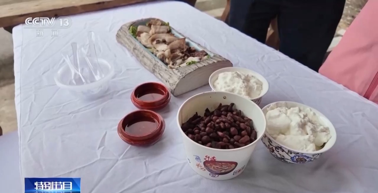 这碗酸奶是尼屋乡当地的群众自己做的,尼屋乡比较特别的吃法在于它里面添加的“小料”。不同于以往的酸奶加入的是白糖、人参果等等这一类的“小料”,尼屋乡酸奶里面是可以加入辣椒和香菜的。桌上摆放了辣椒,还有包括这一碗加入了香菜的酸奶。如果大家尝一口的话会发现,虽然这个听起来比较“黑暗料理”,但是在一碗酸奶里面,能够品尝到咸、香、辣味,还混着一点醇厚的奶香味,层次是非常丰富的。