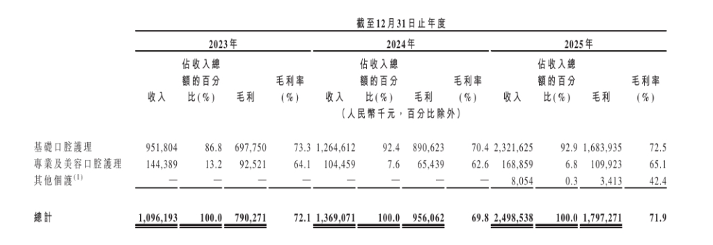 招股书披露的资料显示,公司是中国增长最快且领先的口腔护理产品集团,专注于提供全方位口腔护理产品。公司援引弗若斯特沙利文的数据称,以2025年零售额计,公司是中国口腔护理产品市场的第三大集团,并于2025年实现中国口腔护理产品集团在线渠道最高零售额。2023年至2025年,在中国前五大口腔护理产品集团中,公司的零售额录得最高复合年增长率。主要牙膏产品的建议零售价格在9.9元至49.9元,公司援引弗若斯特沙利文的资料,以2025年零售额计,公司在质量牙膏市场排名第一,市场份额达19.2%。以零售额计,于2025年在中国在线口腔护理产品市场口腔护理产品占比8%,牙膏占比9.2%,两者排名均位列第一。