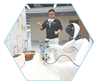 在中国雄安集团数字城市科技有限公司具身智能训练场,工作人员对机器人进行具身智能训练。新华社记者 朱旭东摄
